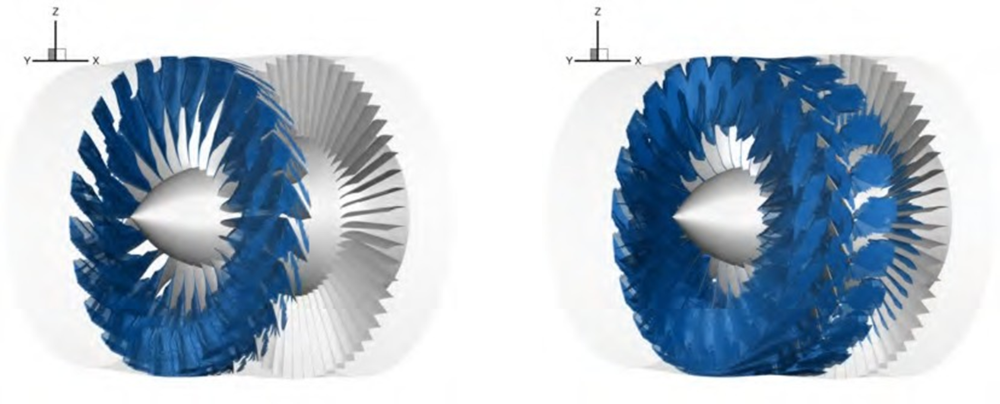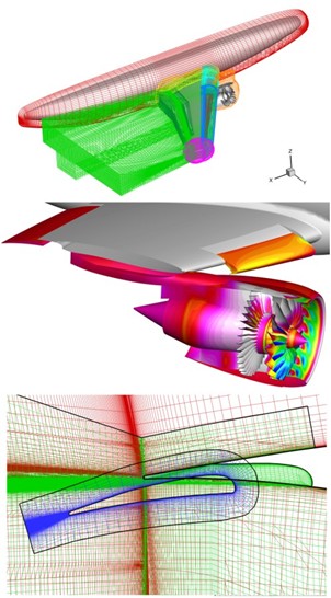 Finally, the activities carried out by ONERA on the NOVASPIRE configuration within the framework of the European Clean Sky 2 program were presented. This configuration, representative of a civil aircraft equipped with an underwing ultra-high bypass ratio (UHBR) engine, is modelled in detail, with a complete representation of key elements such as the rotating fan, the fixed ogive vanes (OGV), and the high-lift devices during take-off. URANS unsteady simulations were performed to faithfully reproduce the complex interactions between the engine and the aircraft airframe, which are particularly important with UHBR engines. This work demonstrated the feasibility of such complex numerical simulations, validating the approach for analysing the installation effects of the new generation of aircraft.