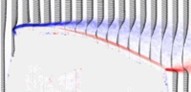 For example, shock waves forming at the fixed blades of the stator (OGV) under blocked flow conditions (see figure on the right) are generally excluded from integration by the standard method for calculating shock wave anergy, because they are in the wake of the fan blades. In contrast, the proposed method takes them into account.