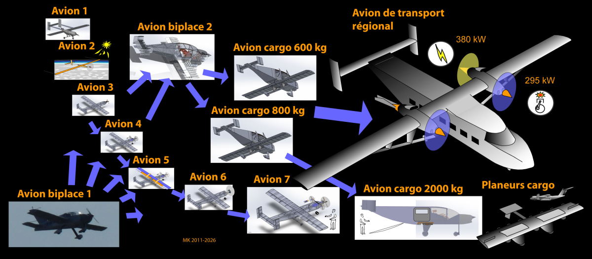 Au-delà de la conception de ces avions, seront évoqués la production, les essais au sol et en vol de l'avion 5 hybride à moteurs non liés, démonstrateur d'un avion de transport régional particulièrement économique. L'avion 5 sera exposé lors de la conférence. Sera également présenté un concept d'avion gros porteur court-courrier dont le besoin en énergie est proche de celui des trains à grande vitesse. Les avions sans pilote réalisés et testés au sol et en vol sont industrialisés, conçus dans un esprit de réduction des coûts par la simplification des systèmes et respectent les points clés de la réglementation aéronautique CS23.