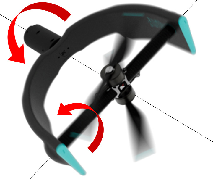 Le système de propulsion omnidirectionnelle mis au point par AERIX SYSTEMS repose sur une archi- tecture mécatronique avancée, basée sur un principe de propulseurs montés sur cardans. Chaque unité propulsive est conçue selon une configuration en fourche, intégrant deux moteurs synchronisés qui contrôlent avec une extrême finesse l’orientation de la poussée générée par un moteur Brushless. Cette double motorisation permet de maîtriser l’orientation de la poussée inférieure au degré, en ajustant dynamiquement l’angle du propulseur dans l’espace, indépendamment de la position générale du vecteur aérien. Cette approche permet un contrôle vectoriel complet des efforts générés par chaque propulseur, garantissant une stabilité active sur les trois axes de rotation (tangage, roulis et lacet) tout en permettant au drone de voler, manœuvrer ou maintenir une position fixe dans n’importe quelle orientation spatiale. Cette innovation mécatronique a été rendue possible par la réalisation de composants électro- mécaniques inédits assurant l’alimentation des Brushless malgré les rotations et le tout sans aucune limite de tour. L’innovation de la propulsion omnidirectionnelle n’est pas simplement hardware mais également software avec de nombreux algorithmes (l’ensemble de la brique Guidage, Navigation, Contrôle étant propriétaire) permettant d’asservir de façon centimétrique et subdegré. La propulsion ainsi orientable est pilotée en temps réel par un système de commande embarqué développé par la société.