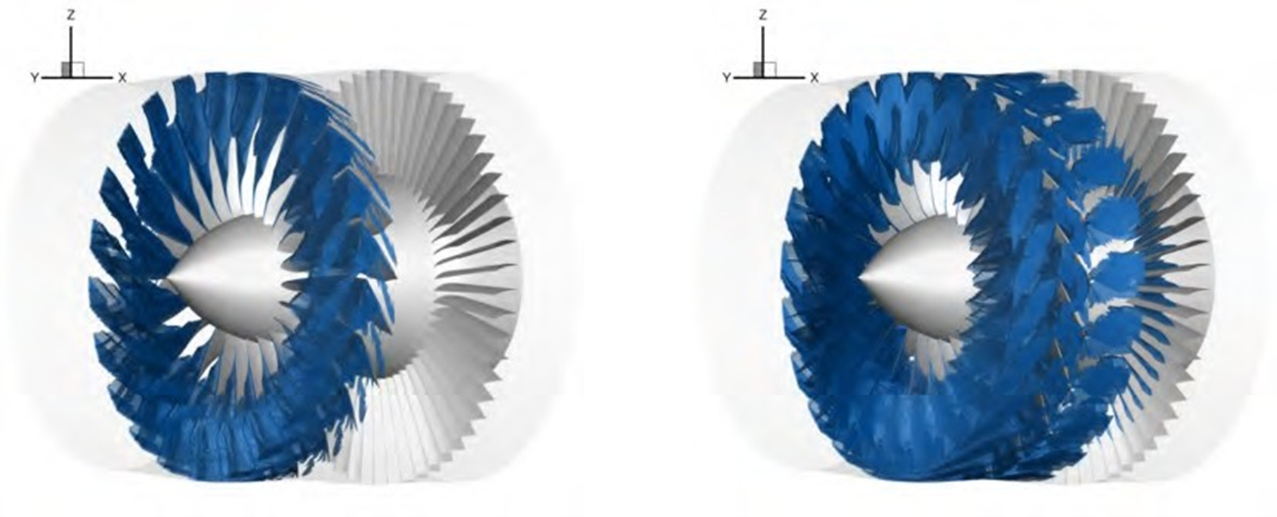 Enfin les activités menées par l'ONERA sur la configuration NOVASPIRE dans le cadre du programme européen Clean Sky 2 ont été présentées. Cette configuration, représentative d'un avion civil équipé d'un moteur à très fort taux de dilution (UHBR) sous voilure, est modélisée en détail, avec une représentation complète d'éléments clés tels que la soufflante en rotation, les aubages fixes du redresseur (OGV), les dispositifs hypersustentateurs en conditions de décollage. Les simulations instationnaires URANS ont été réalisées pour reproduire fidèlement les interactions complexes entre le moteur et la cellule de l'avion, qui sont particulièrement importantes avec les moteurs UHBR. Le travail a démontré la faisabilité de simulations numériques aussi complexes, permettant de valider l'approche pour analyser les effets d'installation de la nouvelle génération d'avions.